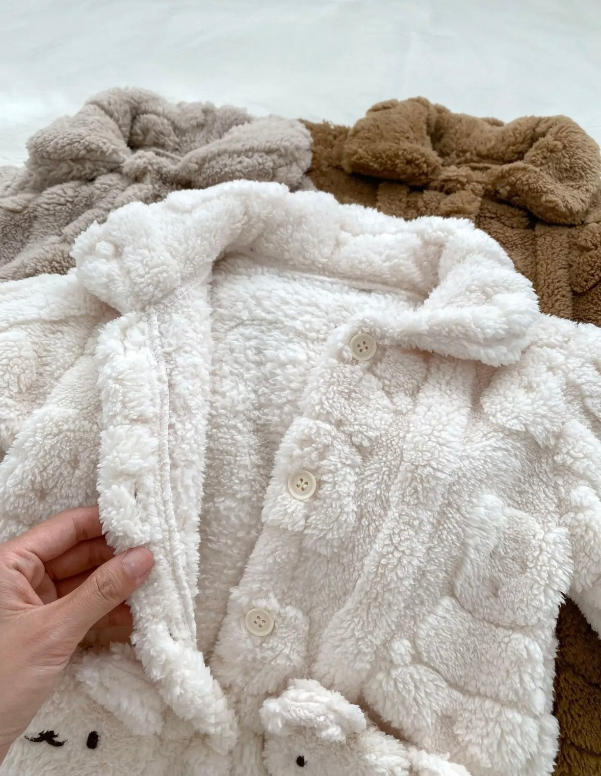 This winter fleece lined baby romper features a soft, warm fur lining that will keep your baby cozy and comfortable during the colder months. Made with high-quality materials and careful craftsmanship, it provides both style and practicality for your little one. Perfect for any winter outing or occasion.